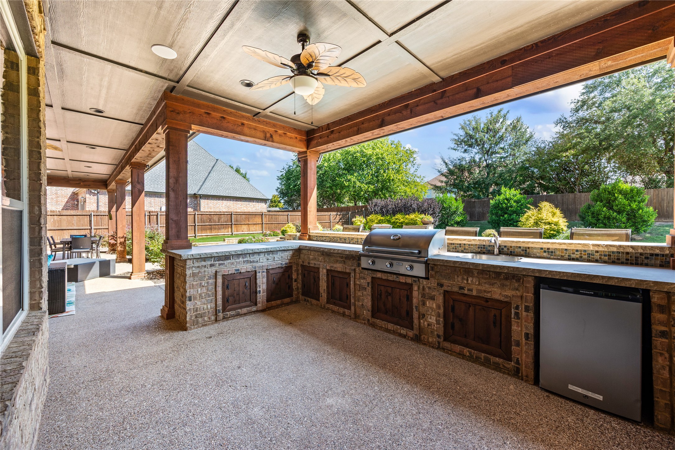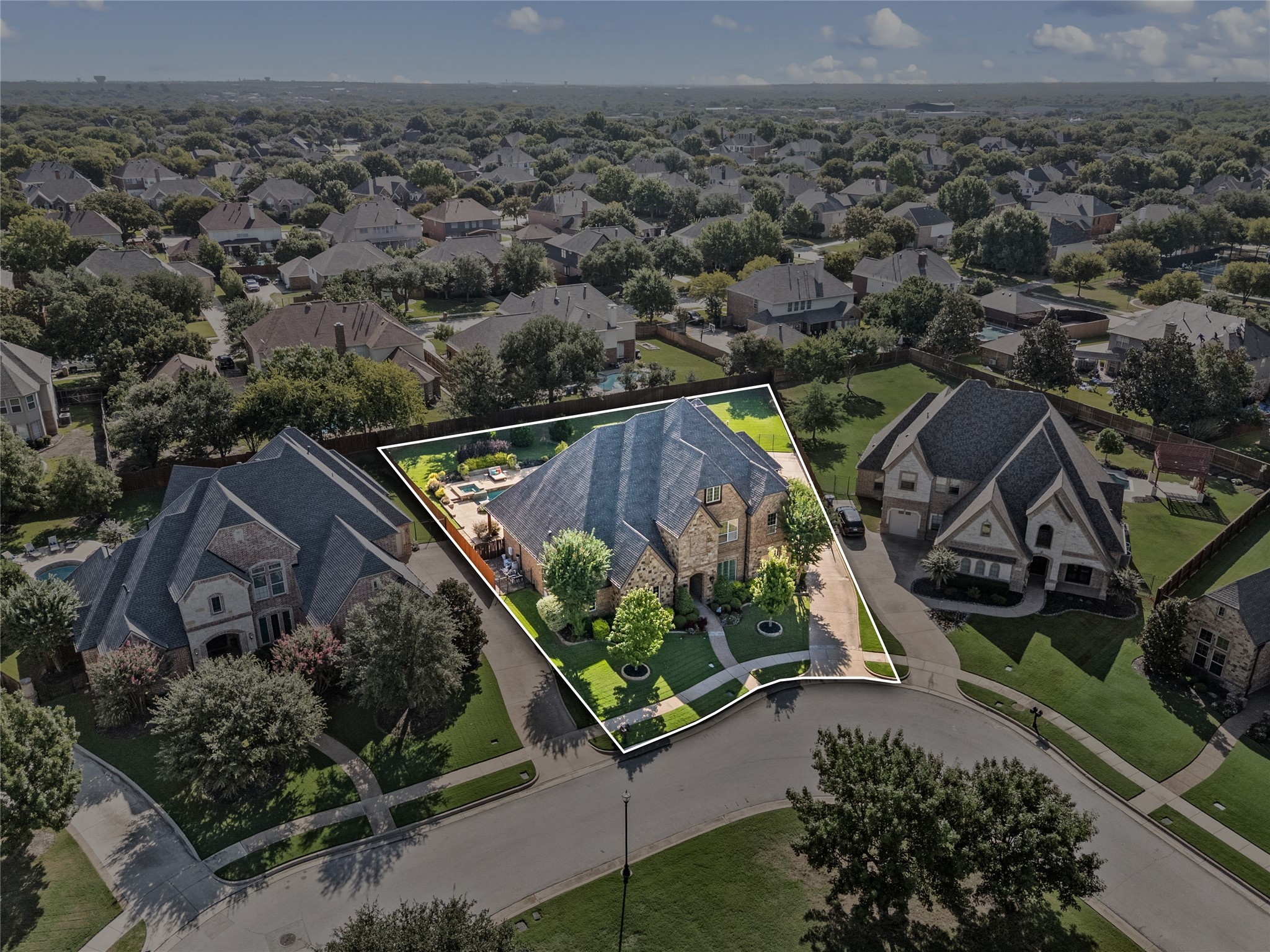 Meticulously maintained, one-owner, custom home in the quiet Camden Park subdivision. Presenting the rare combination of a custom finish-out, privacy, and functional outdoor play space. The kitchen has been recently updated with a large center island and amazing Fantasy Blue Satin marble countertops. Stainless steel appliances, including a 6-burner gas range and double ovens. Huge walk-in pantry and butler's pantry with wine storage and refrigerator. Exceptional floor plan with the kitchen open to the living room and breakfast space, plus a first-floor media room, home management desk, and utility room all within steps of the kitchen. Dedicated office with French doors, vaulted ceiling, and built-in bookshelves. Primary bedroom retreat featuring a seating area, dual vanities and closets, a jetted tub, and an oversized shower with dual shower heads, a rain shower, and a body sprayer. Gorgeous backyard with resort-style Claffey Pool, spa, built-in table, elevated tanning ledge, wired speakers, custom landscape lighting, all surrounded by plenty of green lawn. Covered back patio with fireplace, outdoor kitchen with built-in gas grill, bar seating for 8 guests, and a pool bath. Impeccable 3-car garage with epoxy floor and custom built-in storage cabinets and wall organization. Award-winning Carroll ISD. This property has it all, too many details to list here. Schedule your private showing today!